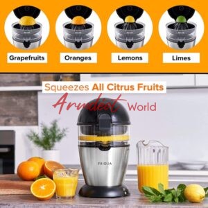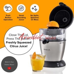 A fully automatic citrus juicer, operated by the touch of a button. Simply half oranges, grapefruits, lemons or limes, close the lid and press a button to make freshly squeezed citrus juice.