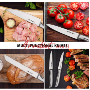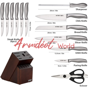 Professional QualityMade of high quality stainless steel and equipped with a solid wooden knife holder. It can not only meet all your basic needs, but also keeps your kitchen clean and improve your cooking experience. |