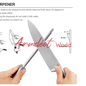SharpenerKeeping in excellent condition will enhance chef capabilities. Easy to use, quick and safe. Use non-woven cloth soaked with cooking oil to wipe the body and dry it; if washed with water, be sure to wipe the rod dry completely after washing and hang in a cool place to air-dry; do not put the sharpener into the dishwasher |