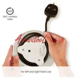 Features include illumination and easy view water window. The large 1.5L capacity, combined with its rapid boil element, means you can quickly boil up to 6 cups. The removable limescale filter ensures a quality hot drink and the 360° base is ideal for both left and right handed users.