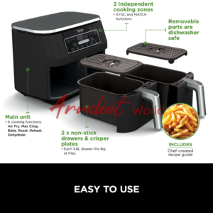 The air fryer that cooks 2 foods, 2 ways, and finishes at the same time. Mix and match cooking programs, times and temperatures. Get more from your air fryer with 6 cooking functions – Max Crisp, Roast, Bake, Reheat, Dehydrate and Air Fry.