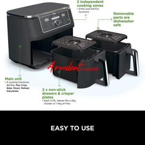 2 INDEPENDENT COOKING ZONES: Cook 2 foods, 2 ways, both ready at the same time. Use different functions, times and temps in each drawer to create complete meals in one appliance, or cater to 2 tastes.