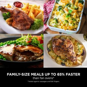 7 COOKING FUNCTIONS: Air Fry, Max Crisp, Roast, Bake, Reheat, Dehydrate, Prove. Quick family meals up to 65% faster than fan ovens* (*Tested against fish fingers and sausages, including preheat)