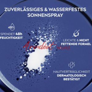 Details NIVEA SUN Protect & Moisture SPF15 Sun Spray provides you with highly effective UVA & UVB protection that immediately protects you against sunburn and premature skin aging alongside providing skin moisture for 48H. NIVEA SUN Protect & Moisture SPF20 Sun Spray provides you with highly effective UVA & UVB protection that immediately protects you against sunburn and premature skin aging alongside providing skin moisture for 48H. NIVEA SUN Protect & Moisture SPF30 Sun Spray provides you with highly effective UVA & UVB protection that immediately protects you against sunburn and premature skin aging alongside providing skin moisture for 48H. NIVEA SUN Protect & Moisture SPF50+ Sun Spray provides you with highly effective UVA & UVB protection that immediately protects you against sunburn and premature skin aging alongside providing skin moisture for 48H.
