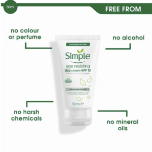 Help to defend your skin against the early signs of ageing with our Simple Regeneration Age Resisting Day Cream SPF15! When your skin is happy and feeling youthful, it can give your beauty routine a boost. Our Age Resisting Day Cream features a special blend of ingredients, containing Pro-Vitamin B5, Vitamin E, Mushroom Extract, Oat-Beta Glucan and Green Tea Extract, which helps to moisturise, soften and tone the skin and helps fight the signs of premature ageing.
