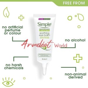 Simple Kind to Skin Soothing Eye Balm contains the perfect blend of multi-vitamins and skin-loving ingredients to reduce puffiness and wind down your tired eyes. Containing simple ingredients that provide impressive results such as pro-vitamin B5, vitamin E, bisabolol and jojoba oil, this under eye cream is designed for sensitive skin, yet loved by all skin types. It’s dermatologically tested, hypoallergenic and non-comedogenic so you can use it worry-free. Our eye cream balm contains no skin-harmful ingredients like artificial perfumes, colours, alcohol, or harsh chemicals that could lead to skin irritation. HOW TO USE: Apply a dash of the balm to your delicate eye area and gently pat until absorbed. For best results, use is as a part of your morning and evening skincare routine. Be careful not to get the product into your eyes. We believe in continuously working to be kinder to your skin, the planet and people. We make positive changes to reduce our impact on the environment and work continuously to become a more sustainable brand. You can help, too. Remember to recycle the tube according to the instruction on it. Simple is globally certified Cruelty-Free by PETA, which means we don’t test on animals anywhere in the world. Simple, the UK’s #1 facial skincare brand*. *Based on Nielsen Scan Track (Total GB) data for Facial Beauty Skincare, 52 weeks to 26/12/20 (Copyright 2020, The Nielsen Company)