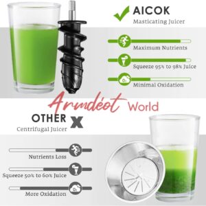 Higher Nutritional Value – As a masticating juicer, the auger spins at 80 RPM that preserves the vitamins, enzymes, minerals, trace minerals and nutrients from being destroyed as opposed to centrifugal juicers. Keep minimal Oxidation, low heat build-up, less foaming and no clogging.