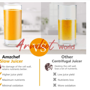 Amzchef Slow Juicer produces high quality fruit or vegetable juices based on a method that minimizes the effects of oxygen and heat and effectively preserves the nutrients, colors and flavors of the ingredients.