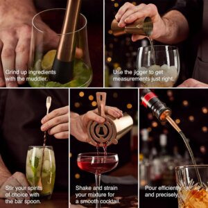 Included in the cocktail shaker set you’ll find a 550ml shaker, Hawthorne strainer, muddler, double jigger, pourer, and bar spoon. All components are specially selected to help you create all your favourites; shaken or stirred, long or short. Crush any herbs with the muddler, measure out the perfect amounts using the pourer and double 25/50ml jigger, stir together with the long-handled bar spoon, and give it all a good old shake. Finally, use the strainer to serve up cocktail bar-worthy tipples.